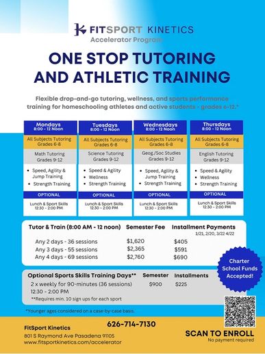 Co-owners of FitSport Kinetics Gym will share their new FitSport Accelerator Program. This new premiere program is an affordable tutoring and sports performance training for homeschool athletes and active homeschoolers. Parents know the demands of elite youth athletics: the training, travel, homework, and dinner in the car. Homeschooling is a fast-growing alternative for families on the go (for various reasons) but the commitment can be daunting, especially for parents. FitSport's Accelerator program offers a solution. We provide a safe, clean learning environment, experienced tutors, and world-class sports performance training all under one roof, with affordable no-cost, and low-cost options.
